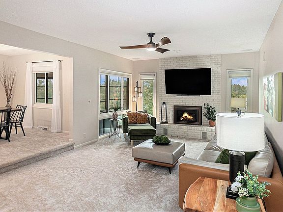 On the main level, the chef’s kitchen includes custom hickory cabinets, granite countertops, a ceramic cooktop, double oven, built-in ice maker, and pantry. The main living area has a gas fireplace and all new carpet, creating a warm and updated space to gather. The master suite offers a cozy fireplace, walk-in closet and a spa-like bathroom with two sink vanity areas, a large walk-in shower, and a whirlpool tub. Convenient main floor laundry.