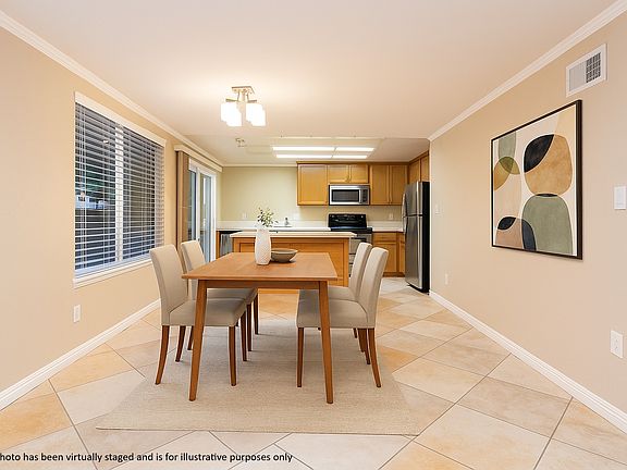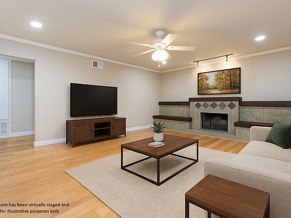 The modern kitchen, bathrooms, living room, and primary bedroom all include recessed lighting, creating a warm and elegant ambiance. The spacious primary suite opens to a private patio and includes a pocket door leading to a beautifully remodeled bathroom.