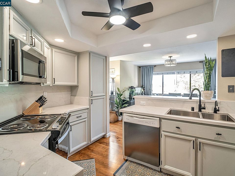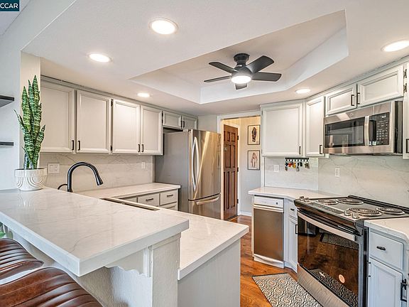 Beautiful condo located in prime North Hayward location. With nearly 1500 sq ft of living space, this single level condo offers 3 spacious bedrooms, 2 full bathrooms and in unit washer and dryer. Corner location offers tons of light light, privacy and views. Recently refreshed carpet & paint with designer touches throughout. Updated kitchen features new quartz counters, stainless steel appliances and a breakfast bar. Large dining room will fit most any dining set plus buffet and more. Large living room a sliding glass door with views of trees that leads to a balcony. Generously sized primary suite with walk in custom closet & en-suite bathroom with two vanity areas and a stall shower. Two spacious bedrooms down the hall, hall bathroom with shower over tub. One parking space included, detached garage with up to 3 car parking for an add'l fee plus storage areas available as well. Water & trash included in rent. Great community with a club house, gym, pool and spa. Awesome location just one block to Safeway, Starbucks, City Sport gym, close to downtown Hayward. Quick freeway access, close to I-880, I-580, I-238 and a short distance to Castro Valley B.A.R.T.. Available for move in mid October, 1 year lease minimum, pets upon approval.