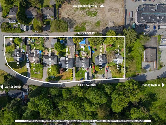 LAND ASSEMBLY in downtown Maple Ridge! Recent OCP amendment supports Low Rise Apartments 4-6 stories. Located within the Lougheed Transit Corridor and just outside the outer of the Transit Oriented Area. FSR up to 2.5 (includes bonus density) and all service at lot line or nearby. Situated on a quiet dead-end street, with lane access and the top floors will have unobstructed views of the Fraser River! Only steps from the West Coast Express, downtown Haney which includes shopping, restaurants, recreation and more! To be sold as a package with 22119, 22127, 22147, 22155, 22165 Cliff Ave and 11758 221 Street. Package price $13,999,300. Private showings only! Do NOT walk on the properties without an appointment.