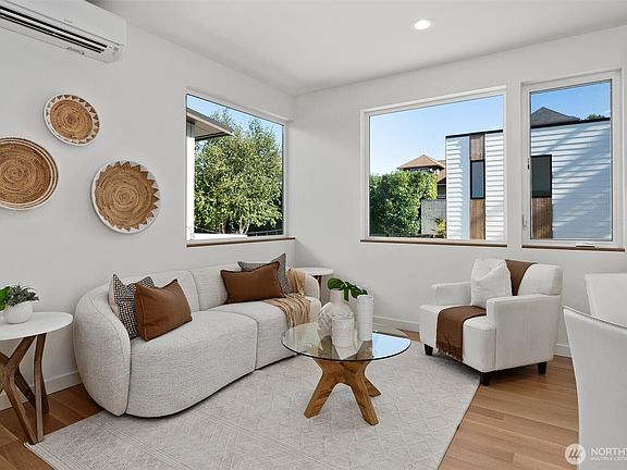 VIEWS, VIEWS, VIEWS! Featured in Architectural Digest, this Pivotal Homes build delivers modern design with elevated craftsmanship. Soak in panoramic rooftop views of the Seattle skyline, Lake Union, and Olympic Mountains—a daily dose of wow. Inside, light-filled interiors and white oak floors create an easy, refined vibe. The custom kitchen with premium appliances anchors the open living area, perfect for gatherings or quiet nights in. A/C throughout keeps comfort on point. Upstairs, the primary suite is your sanctuary with a spa-inspired bath, dual vanities, and generous closets. A main-level bedroom and full bath open to a private fenced patio, ideal for guests or flex use. EV-ready parking and a storage room complete the package.