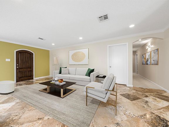 Water wellTravertine flooringGranite countersStainless appliancesSpacious walk-in closetJetted soaking tubPendant lighting