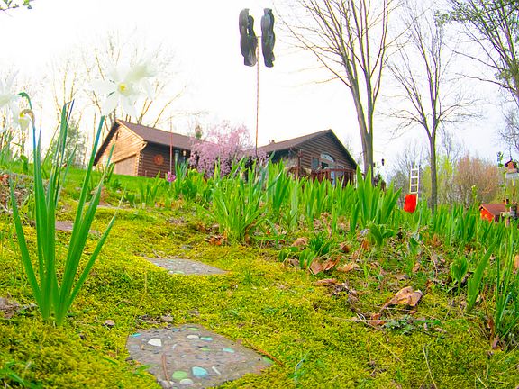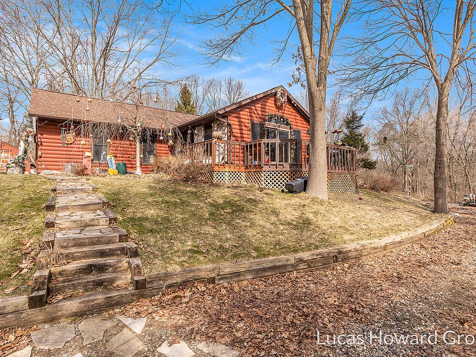 See it to believe it! A Log Home on 5 illustrious acres (4bed/3bath) surrounded by nature, landscaping, and a maintained trail! Be wowed by beautiful cherry floors and resort-like views with natural light right from your living room. The dining room holds a fireplace with a gas stove to keep you cozy all winter long. The open kitchen design creates an inviting atmosphere for guests and chefs alike. The walkout offers a family room, a Mother-in-law suite with a bathroom and whirlpool tub, as well as a 4-season room fit for a plant lover. Outside features a charming 2-story barn (20 x 26) with an upstairs workshop or storage — lower level with 4 box stalls for horses, and your very own riding arena for the equestrian lover. On property contains a second barn (24 x 40) offering storage and a n open run-in shed. Save money on your energy bill with your own 6.7KW Solar array. The property is full of many fruit trees, gardens, herbs, and jaw-dropping landscaping with a feeling of serenity to last you a lifetime! Schedule a showing today to your very own peaceful oasis!