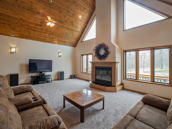 Your dream home awaits in Mattwan! Step inside and begin your tour just past the foyer in the stunning great room with its wood burning fireplace, built-in speakers, and open upper loft. There is both formal dining and an eating area to complement the spacious kitchen, complete with snack bar and plentiful storage. Next, meet your new master suite featuring deck access, walk-in closet, and private bath with dual sink vanity, step-in shower, and jetted tub. The other two bedrooms share a Jack-and -Jill bath, each with private lavatory. Main floor laundry. Downstairs, you will find the finished walk-out basement with a beautiful built-in bar, entertainment room, and half bath. Some of the best features may well be outside with the large connected decks, swimming pool, and waterscapes; attached 2-car garage, and wired pole barn with workshop and baseball pitching room. Incredible wildlife on the 13 acres including big bucks and plentiful turkey.