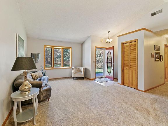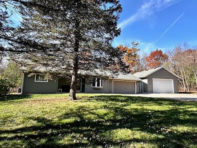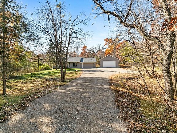 If you're looking for a quiet neighborhood with mature trees and scenic winding roads you're in the right place! This one level home is situated on 2.5 private acres! Oversized attached garage + 28 x 24 detached, heated garage, both have extended concrete aprons. The home has all living area on the main level, no stairs. Featuring vaulted ceilings and 6-panel doors. The main floor family room has a gas fireplace and there is an office alcove adjacent to