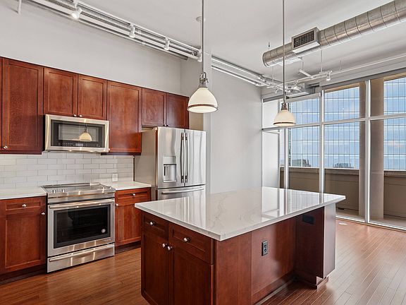 Wrap-around terraceFloor-to-ceiling windowsHardwood flooringStainless steel appliancesGourmet kitchenRich maple cabinetry