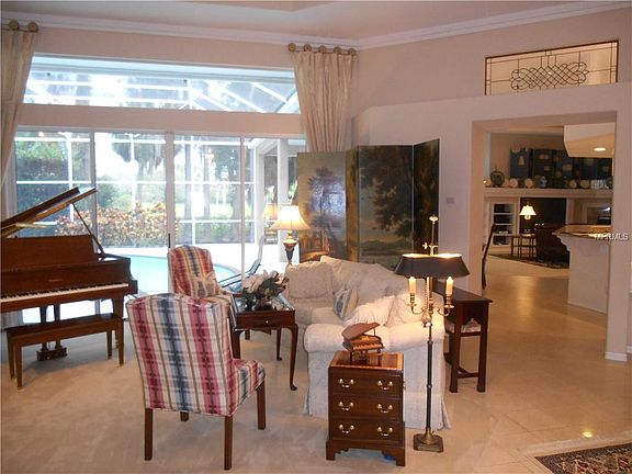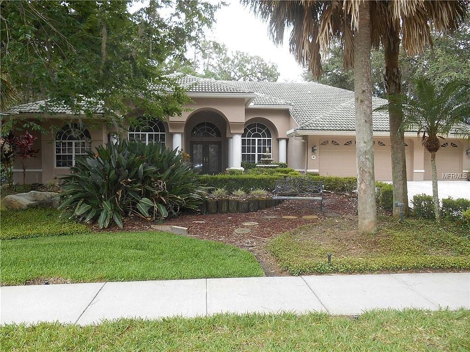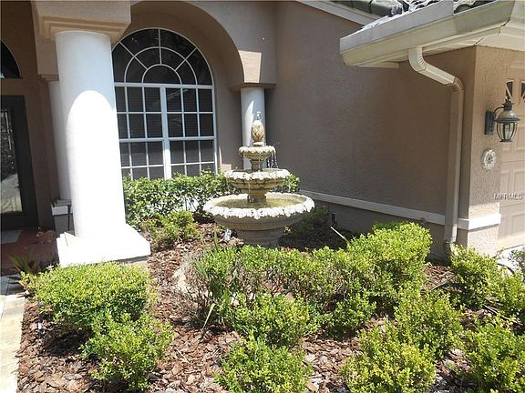 Former model home situated on the 10th green of the Eastlake Woodlands Golf Course, offering panoramic views of the course and pond. The front entrance offers a stamped driveway and brick walkway which leads to the entrance with elegant leaded glass doors. The interior of the home features special ceiling treatments in every room, with crown moldings, indirect lights and accent colors. Botichino Fiorita Marble floors extend from the foyer over the entire dining room and walkway area into the kitchen. The marble also extends from the foyer the other way to the powder room and to the Master Bedroom and thoughout the Master Bath. Custom window treatments throughout, including Plantation Shutters in the Master Bedroom with view of pool and panoramic view of golf course. Spacious Kitchen with eat-in dining area, granite countertops, and stainless steel appliances. The family room has a 48 inch Marble gas fireplace and a 72 -inch TV with surround-sound speakers for the ultimate in the Home Theater experience. The Master suite has his/hers walk-in closets, a sunken shower and luxurious, new jacuzzi tub. Home features 12 mm film on all windows to decrease glare and sun damage and add strength in high winds and hurricanes. Enclosed covered lanai, 20 X 10 with outdoor cooking area. Pool is 25 X 12 with additional spa area. HVAC is 5 ton, zone system, still under warranty. 3 car garage with steel reinforcement for both doors. Large wooded lot about .6 acre. 118 ft at the curb and 190 ft deep.
