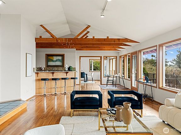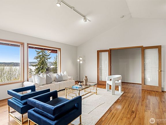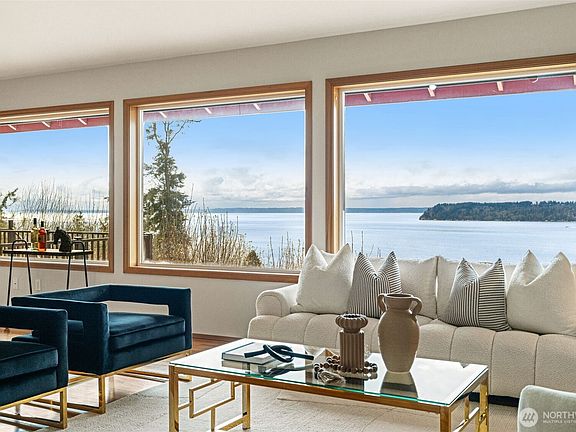 Gated bluff-top home on 1.85 acres with stunning Sound, mountain, island & sunset views. Bright rambler with daylight basement, vaulted ceilings, hardwoods, granite kitchen, and spa-like primary suite. Great for entertaining with open layout, large deck, and formal dining/family rooms. Double garage + guest parking. Private, stylish, and built for comfort!
