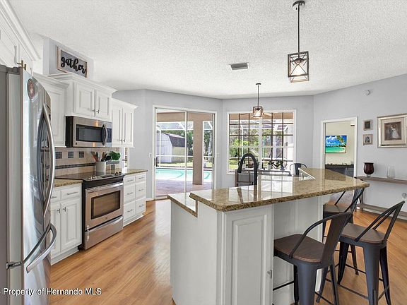 BACK ON MARKET! Buyer Default. Welcome to your dream home on a half-acre fenced lot with a private, enclosed pool and NO HOA or CDD! This stunning 3-bedroom, 2-bathroom home offers 2,118 sq. ft. of living space with a new AC (2019), an open floor plan, large windows that fill the space with natural light, and a stunning mixture of high-quality luxury laminate and tile flooring throughout! The chef's kitchen is a standout, featuring white solid wood cabinets, granite countertops, a stylish backsplash, stainless steel appliances, and a central island. The primary suite includes a walk-in closet and an ensuite bathroom with a jetted tub, double vanity, and custom wood cabinetry. Both bathrooms boast matching granite countertops and solid wood vanities for a cohesive, luxurious feel. Outdoors, the fenced backyard features lush landscaping with mature trees, a large shed, and 4 access points to the pool, where the pump was replaced in 2024. The patio furniture conveys, making it perfect for outdoor relaxation. Additional features include a separate laundry room with a utility sink and extra storage. Located in the heart of Spring Hill, you're just minutes from shopping, dining, hospitals, and easy access to the Suncoast Parkway for a quick commute to Tampa. Everything you need, from Walmart to Publix and Home Depot, is within 2-10 minutes of this prime location!