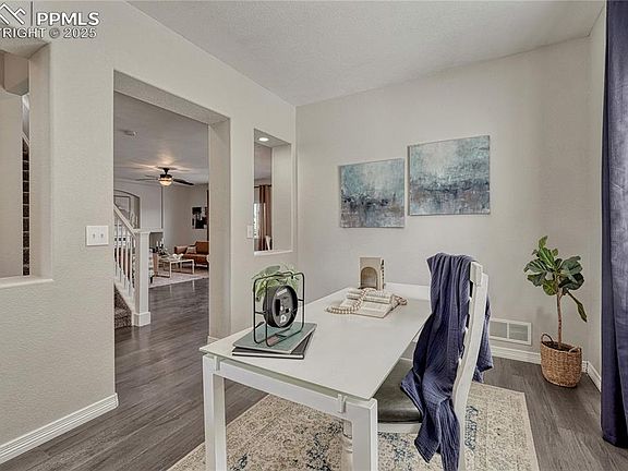 2-story floor plan with 3 bedrooms and 2.5 baths with Central Air and an unfinished basement for future expansion! * Attached 2-car garage * Gorgeous flooring flows through the main level making this open floor plan feel spacious. The main level office can also be used as a formal dining room or flex space. The kitchen features new countertops with a butcher block island, a pantry, plentiful cabinets, a neutral backsplash, recessed lighting, and a window over the kitchen sink. The dining area provides a walk out to the backyard and opens to the spacious living room with a gas fireplace, built-in's, and a ceiling fan. The main level half bath is in a perfect location, close to the front door. Upstairs, you will find a large loft that provides mountain views, three bedrooms, two baths, and a laundry room. The expansive primary bedroom does not share a wall with the secondary bedrooms and features an adjoining 5-piece bath with a soaking tub, separate shower, spacious double sink vanity, linen closet, and a large walk-in closet. The secondary bedrooms share a full bath. The laundry room has a nice storage closet. The fenced backyard is fully landscaped and offers a patio for relaxing and enjoying the Colorado Sunshine. Park across the street with basketball courts, walking trail, green space, and playground! Located just minutes from the Powers Corridor, you’ll have quick access to shopping, dining, and entertainment at First & Main Town Center. Less than 10 minutes from Peterson Space Force Base!
