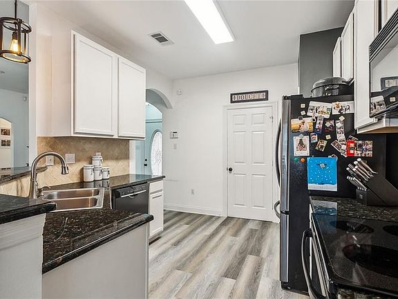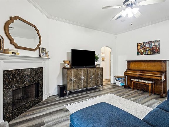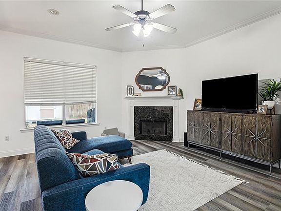 Come and see this affordable and comfortable three bedroom two full bath home set on a corner lot with fenced in backyard. The spacious den with crown molding features a corner fireplace/mantle and a wall that is perfect for that big screen tv. The kitchen has a large pantry, sink that overlooks the den and white cabinets with granite tile counters. It also has electric range/oven and microwave. Attached is the breakfast room with a window overlooking the rear covered patio and yard, The relaxing primary bedroom has crown molding and a trey ceiling. The primary bath has double vanities, double closets, tub and a separate walk in shower, The additional two bedrooms are spacious and the second full bath has updates. Enjoy the covered patio and large fenced back yard that also has a bonus shed. Make this affordable home yours today.