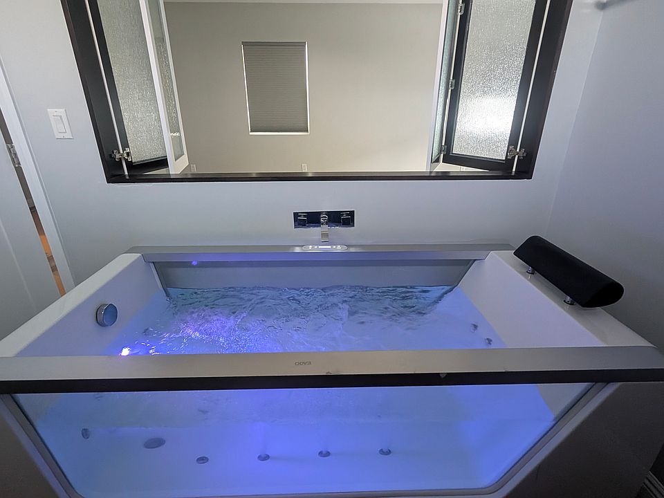 3 BED + 2 BATH with a spacious master suite (approx. 400 sq. ft.), which is a retreat in itself with a large walk-in closet. A scenic rain glass window separates the en-suite bath, which features a state-of-the-art EAGO clear whirlpool spa-tub with built-in music, a large stand-alone shower with white tile & rock stone flooring, and a custom-built double espresso vanity with matching linen tower.
