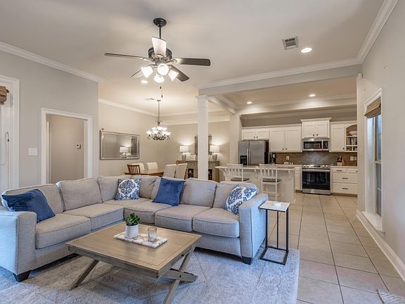 Come see this gem tucked in the popular Springlake at Bluebonnet Highlands subdivision! Nestled into the heart of the neighborhood, you can find this open living area home featuring approximately 1800 sq ft with 3 bedrooms & 2 baths with split floor plan. Enter the front door to see the tile flooring, tall ceilings, crown molding, and the many details of the main living room plus a gas fireplace & wood mantel. Home has been painted with neutral colors in much of the living spaces. Appreciate the natural light the flows into the home from the front & the back. There is a large open dining space adjacent to the kitchen featuring an abundance of white cabinets, large island, and new stainless appliances that include a smooth top electric range & microwave hood vent. This space is perfect for entertaining family & friends. Appreciate the easy access to the extended back patio with full privacy fence. Check out what is just beyond the back gate...a HUGE open field for the kids to play, which is maintained by HOA. You can retreat to the master suite with its private en-suite bath featuring a soaker tub, separate shower, dual vanity & walk-in closet. On the opposite side at the front of the home are two additional bedrooms with shared full bath. Additional features include: enclosed two car garage, window coverings to remain, office nook, flex space off the kitchen, gutters, & mature landscaping. HVAC is approximately 4 years old. The neighborhood has a community swimming pool, playground, tennis courts, & basketball court for all residents to enjoy. This neighborhood has sidewalks and an active HOA that regularly hosts social events at the clubhouse. This home qualifies for Rural Development Loan 100% financing. Located in Flood Zone X ? flood insurance is not required. This home did not flood in 2016.