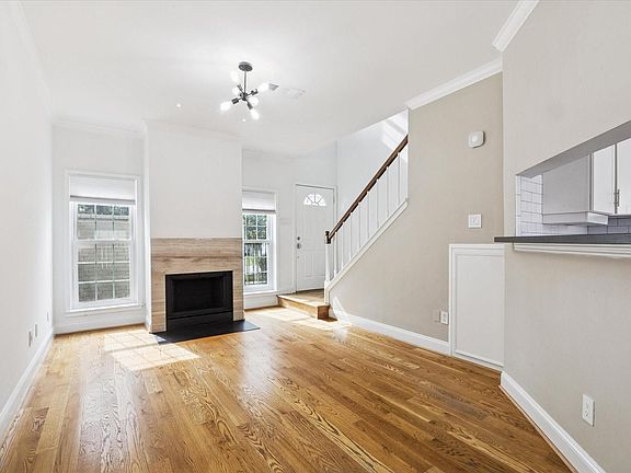 Immaculate and updated Montrose two-story condo with desirable first-floor living! The kitchen features honed granite counters, subway tile backsplash, shaker cabinets, and GE stainless steel appliances. Beautiful wood-burning fireplace with marble surround, custom wood floors, and window shades throughout. Upstairs primary suite offers cathedral ceilings, French doors to a private balcony, a stunning spa-like bathroom, and a smartly designed closet. Enjoy a private front patio, gated carport parking, and a sparkling community pool. Prime Montrose location—move-in ready and truly a showplace!