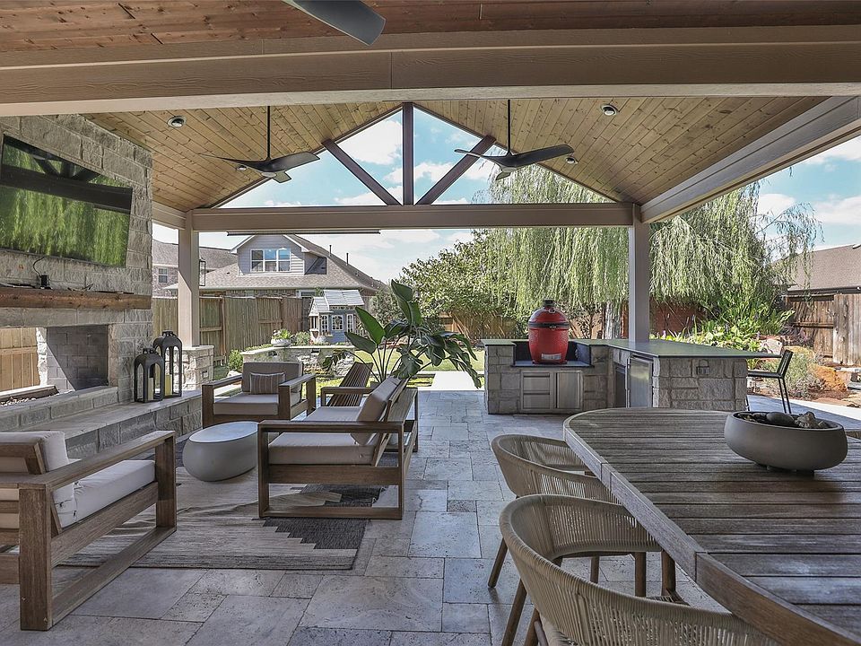 This stunning 4-bed, 3.5-bath home offers the perfect blend of luxury and functionality with a game room, private study, and an additional upstairs game/media space. Soaring 20' vaulted ceilings and low-maintenance sleek tile flooring create an open and airy feel throughout the main living areas. Step outside to your private backyard retreat featuring a tranquil koi pond, full outdoor kitchen, and a dual-sided fireplace ideal for year-round entertaining. Cane Island residents enjoy unmatched amenities including an on-site restaurant, pickleball courts, parks, two pools (family and lap), a 2-story fitness center with yoga and group classes, and a vibrant lifestyle calendar all zoned to award-winning Katy ISD schools. This home has been meticulously maintained and is ready for immediate lease. Experience the Cane Island lifestyle today! Garage storage stays with the property along with a fridge, washer and dryer; Koi pond and lawn covered by landlord.
