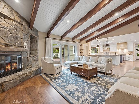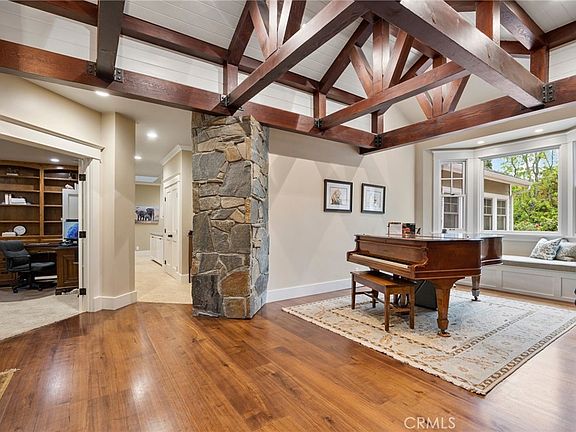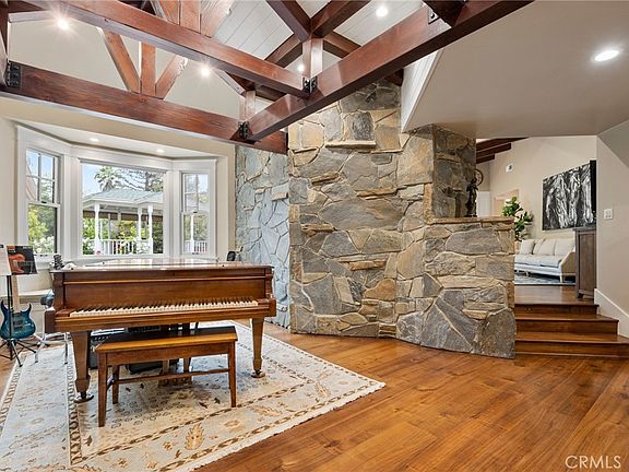 This custom estate has so much to offer. It sits on nearly an acre of level land w/lush, manicured, mature landscaping. The scale of the home is grand but the vibe of this one-story home is very cozy from the moment you enter the foyer with its unique, open beamed gable. Walnut floors create warmth throughout the main living spaces as do the quartzite countertops & accent walls that breathe life into the expansive open concept kitchen. This thoughtfully designed kitchen, built in 2021, has it all - custom soft close cabinetry, an island AND a peninsula, corner breakfast nook, walk-in pantry with coffee/smoothie station, drawer organizers for knives, spices & utensil dividers plus two appliance lifts that make using your KitchenAid mixer & food processor easy, yet keeps them hidden from view. The gourmet in the family will positively swoon. The kitchen opens onto the family room which has open beamed ceilings & a floor to ceiling slate fireplace. The dining room has impressive custom woodwork on the ceiling and shares a second floor to ceiling slate fireplace with the living room just a few steps down. The current owners are using the living room as a game room - how will you use this space? The primary suite has a third, two-sided slate fireplace, meditation/exercise space and TWO full bathrooms. One bathroom has a stand alone vessel tub for soaking. The other has a sauna, extra built in linen storage and a small tv (so you can keep current with the news while you get ready for your day). Two ancillary bedrooms share an over-sized bathroom while the fourth has an en-suite bath and the fifth (off the kitchen) has a bath next door - a great spot for guests/in-laws/live-in help. Working from home will feel truly opulent in this office with a French door entry & floor to ceiling built-in storage. There's room for everything you need to run your empire from home. The mind-blowing back yard will make you "fun central" this summer & beyond. You can easily entertain groups from 2 to 200. The covered outdoor dining area, built-in BBQ, heated swimming pool with rock slide & waterfall, spa, manicured lawn, raised garden beds, animal pen & chicken coop mean you'll be well equipped to enjoy the lifestyle La Habra Heights offers. Dual HVAC, central vacuum & solar panels that are owned (not leased) make this home energy efficient and easy to maintain. Come see how this show stopper will have you feeling like you're at home.