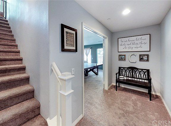 Location! Location! Location!..in addition to being freeway close and near tons of shopping, this spacious end unit (does not butt to Newhall Ranch Rd.!)has a prime location in GATED River Village development. Enjoy living in a private end unit next to a gentle scenic slope with a peaceful view. Near new & over 2,300 square feet of living space on three levels, 4 bedrooms! 4 baths! making this home ideal for shared living. Energy efficient carefree in a commuter friendly setting! Interior features a gourmet kitchen with center island, granite counter tops, and tile floors. The living room has plantation shutters & ceiling fan. The ground level has a huge flex space with a private bath that could be used a gigantic 5th bedroom, game room or super sized office! L shaped back yard has stamped concrete patio & conversation firepit with blue hued glass rocks. Living area level has another balcony/patio with large relaxation area. There is also a bedroom & bathroom on this level. Upstairs laundry room & loads of built-in cabinets, 2 more secondary bedrooms with hall bath, & master suite w/ large walk in closets & a spa-like master bath. There is also a direct access 2 car garage w/ tons of storage. Fabulous amenities include a resort style pool and spa w/showers, kiddie playground, and barbeque station! If you are looking for a modern, very low maintenance, large square footage property to move right in....this is it! Call your landlord and storage company with your notice to move!