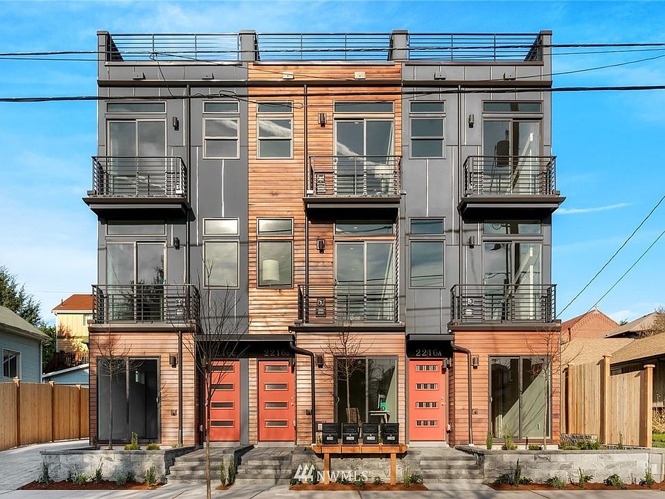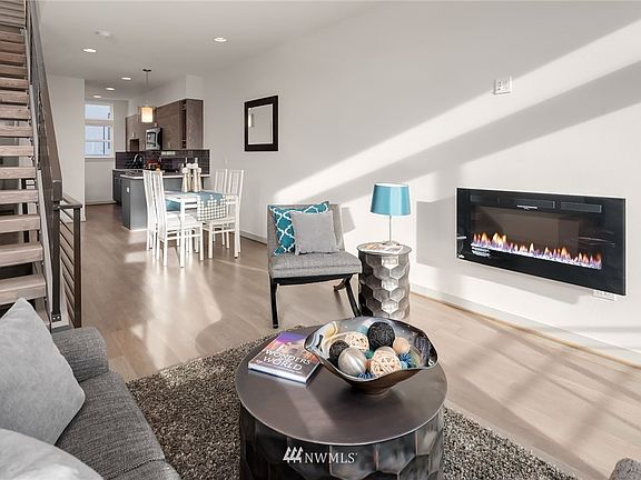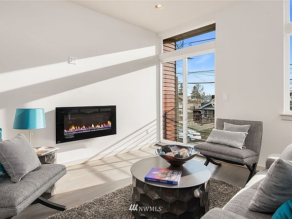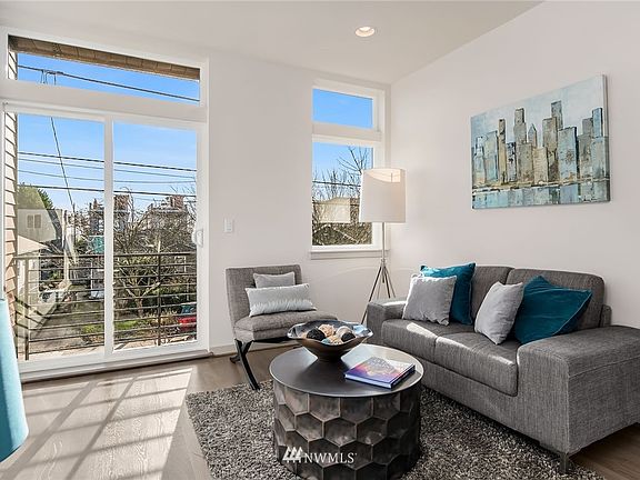Style, function and design come together in this modern new town home well located in Ballard on a peaceful street. Lots of light from floor to ceiling windows with wonderful southern exposure. Beautiful hardwoods, designer finishes, radiant heat, dramatic floating staircase, bright great room, gourmet kitchen, quartz, sleek fireplace, stainless appliances. Huge master suite w/spa like bathroom, separate tub and WIC. Roof top deck with panoramic views, off street parking included. Built Green.