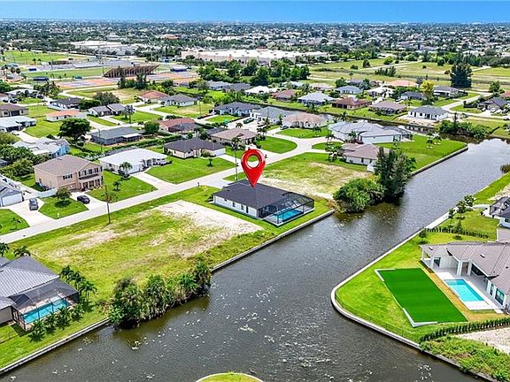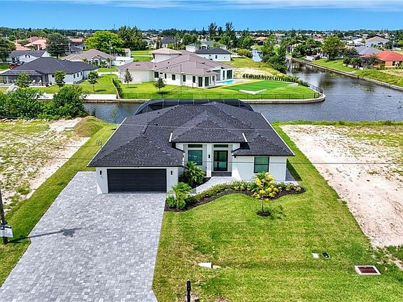 Welcome to your dream home on the Corsaire Canal! This brand-new 4 bedroom + Den, 3 full bathroom pool home is designed for both luxury and functionality. The versatile floor plan includes a private in-law suite with its own entry and full bath that also serves as the pool bath, creating the perfect setup for guests or multi-generational living. Inside, the open-concept layout features a gourmet kitchen with a huge waterfall-edge island, luxury appliances, and custom cabinetry, seamlessly flowing into the spacious living and dining areas overlooking the water. Elegant crack prevention tile flooring runs throughout the home, ensuring long term beauty and durability. Step outside to your private lanai and sparkling infinity salt water pool where you can relax and enjoy the tranquil canal views. Built with impact-resistant windows and doors, this home also offers a paver driveway with extended parking spaces, a two-car garage, and thoughtful designer finishes throughout. With energy-efficient construction and modern elegance in every detail, this home blends style, comfort, and the best of the Southwest Florida lifestyle. No HOA, No Flood Insurance, No Drama! All Assessments in and paid.