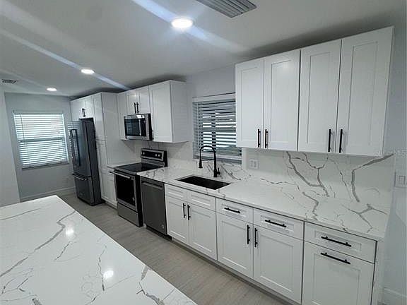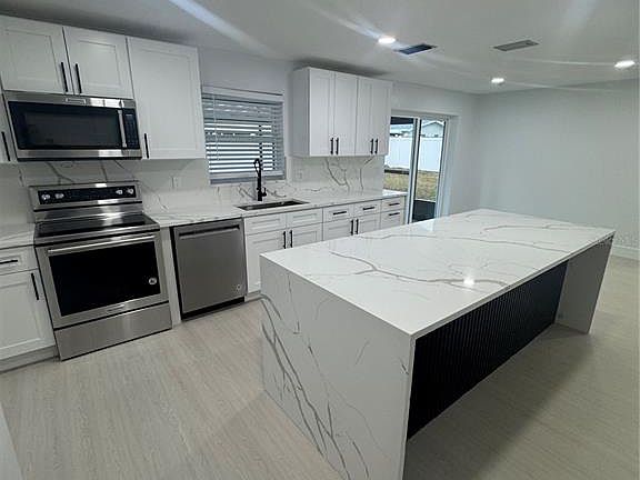 Welcome to your beautifully remodeled Clearwater home! This 3-bedroom,2.5-bath,2-car-garage property shines with modern finishes inside and out. Step into an open-concept living space featuring a brand-new kitchen with waterfall-edge quartz island, stainless steel appliances, and sleek white cabinetry. Both bathrooms are completely redone with designer tile, and matte-black fixtures. Enjoy peace of mind with new windows, updated electric panel, fresh paint, and new flooring throughout. The fenced backyard sits in a non-flood zone-NO Flood insurance required! it offers plenty of room for pets, play, or future pool, while the clean. Low-maintenance exterior and 2-car garage add extra curb appeal. Conveniently located near shopping, parks, schools, and just minutes from World-famous Clearwater beach. Move -in ready and sure to impress.