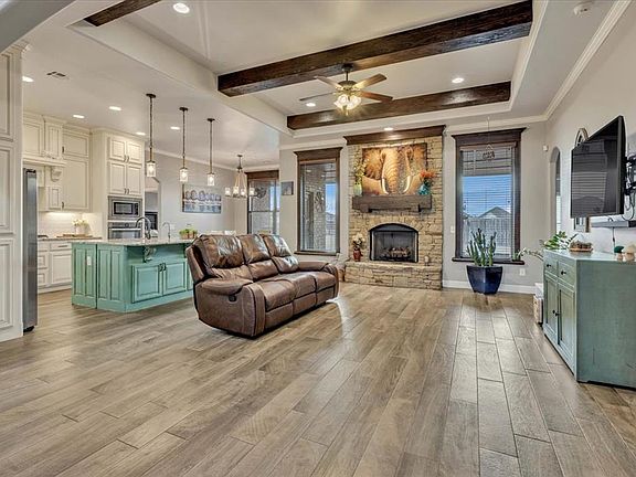 The home’s primary suite includes a large walk-in shower with a separate tub and dual sinks. The laundry/utility room offers generous storage and a large countertop that serves as a convenient workspace, and it opens directly into the primary closet, adding everyday convenience.. Other amenities include a mudroom area off the garage, a storm shelter, wood-grain tile flooring throughout the main living areas, water softener, and an oversized three-car garage.