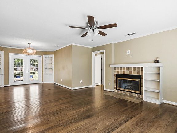 Step inside to a warm, inviting living room featuring built-in bookshelves, a cozy fireplace, and a ceiling fan for year-round comfort. The bright, open kitchen is a chef’s dream, boasting crisp white cabinetry, a farmhouse sink, and sleek stainless-steel appliances that marry modern ease with timeless style.