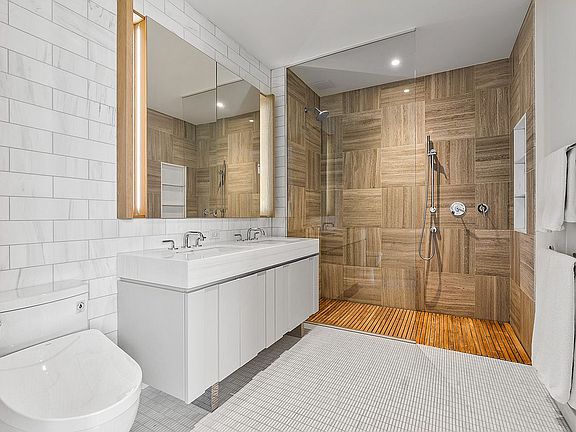 The primary bedroom has a large walk-in closet and an en suite bath which features a dual vanity, Zebra-Mink marble wall tiles, and tons of storage. The walls in the guest bath are lined with ceramic tiles which are complimented by a herringbone pattern on the floor. This bathroom also features a deep soaking tub. Both bathrooms are equipped with Waterworks fixtures. The second bedroom does not disappointment and also has a sizable closet.