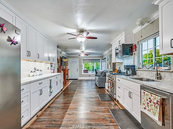 REMODELED with WORKSHOP. Tucked away in a quiet community, you will love this location where you can enjoy mountain views and easy access to the shops, dining and amenities of the city. Greeting you with an RV sized driveway with an electric gate, drought tolerant turf yard and sprawling front porch, you will feel right at home from the moment you arrive. Step inside and into the family room where the love and care that went into this home is immediately apparent. Natural light fills the bright and open space, highlighting the designer vinyl flooring and a gorgeous feature fireplace. The kitchen overlooks the living area – a perfect layout for hosting friends and family. Just recently renovated, you will adore the commercial grade appliances, luxe quartz countertops and custom cabinetry.