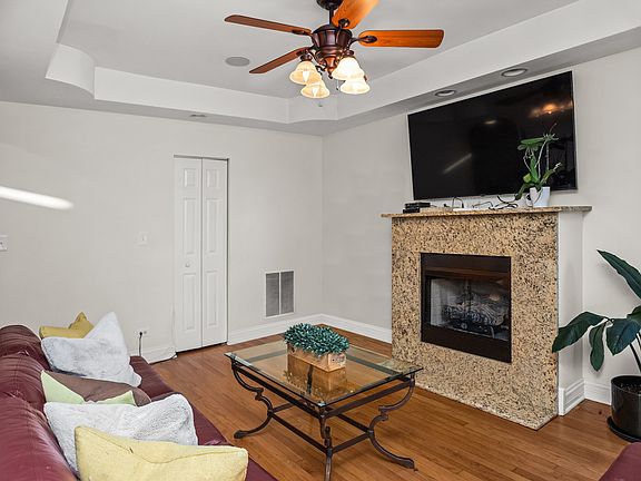 Sunny top floor unit with windows in every room! Gorgeous tray ceilings wired for sound in every room. Living room features beautiful hardwood floors and fireplace perfect for the winter nights. Chef's kitchen offers stainless steel appliances, granite countertops and separate dining area for friends and family to relax while you cook. Primary Bedroom offers plenty of space for a king size bed & dresser plus an en-suite. Second bedroom is perfect for an office or guest suite with a second bath nearby. Home is equipped with in unit washer and dryer and back deck with ample space for a grill. Conveniently located near West Ridge Nature Park, Target, neighborhood coffee shops, cafes & restaurants plus its walking distance to Peterson Metra stop.