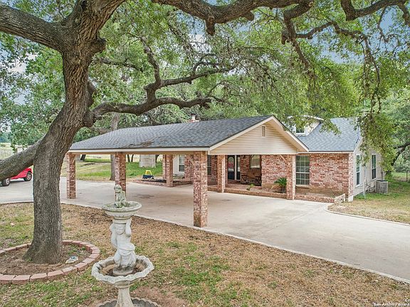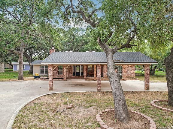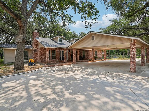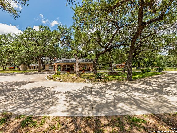 Looking for country living without sacrificing city convenience? You'll love this serene 7-acre homestead in San Antonio city limits, surrounded by mature trees and accessed via a picturesque paved driveway. This single-story ranch-style home boasts natural hardwood floors, three expansive bedrooms, a spacious kitchen with a walk-in pantry, a separate laundry room, and a cozy living room with a fireplace-perfect for gathering. Exceptionally private and not visible from the road, this property is ideal for hosting, with indoor capacity for 25 people and over 80 outdoors in the bonfire area. It features a fully fenced yard with a solar-powered gate and a large back shed providing weather protection for machinery. There are three additional buildings on the property, all with A/C. The first is a beautifully updated casita, complete with new flooring, exterior paint, a renovated bathroom, and a kitchenette. This separate unit also features a walk-in closet, covered porch, and its own laundry room, making it ideal for live-in relatives or as a guest house. The other two are versatile buildings suitable for storage, a personal gym, entertaining, or homeschooling-the possibilities are endless! Minutes from the freeway and within easy reach of downtown San Antonio and Pleasanton, this home offers the perfect balance of rural charm and urban accessibility. Enjoy the benefits of city water, a septic system, and internet poles already installed in both houses. This home truly provides the best of both worlds!