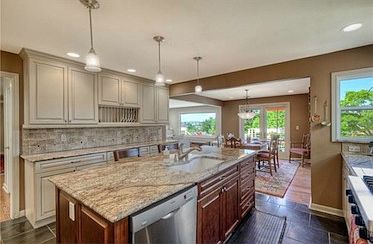 Mid-century, modern, totally remodeled gorgeous view home with all new systems, plumbing, wiring, heating & cooling A/C. Level entry with 2bed & den (could be 3rd bed), 2baths on main & 2bed, 2baths d.stairs with huge family room. Chefs dream custom kitchen w/ slab granite counters, large island, designer tile work, Viking/bosch SS appliances. Light & bright living/ dinning/ kitchen/ decks provide seamless transition between inside & out with fabulous panoramic views. This home has it all!