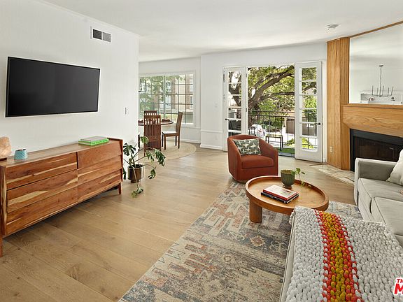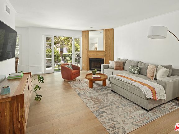 Sophisticated and welcoming, this front-facing contemporary residence combines airy proportions with charming European character. Set above street level, the single-story floor plan spans 1,270 sq.ft. with natural light streaming throughout. The living room opens through elegant French doors to a balcony shaded by mature maple trees, while the adjacent dining area enjoys a leafy street view. The remodeled kitchen features crisp white shaker cabinetry and stainless steel appliances. The spacious primary suite includes double French doors to a private balcony, generous closets, and an ensuite bath with dual vanity. A second bedroom offers flexibility as a guest room or office, served by a full hall bath. Additional highlights include a large laundry room with storage, two tandem garage spaces plus extra storage, and secure guest parking. HOA dues include earthquake Ins, water, trash and basic cable, and internet. Ideally located near Westwood Village, Century City, the new Google campus, and freeway access, this is Westside living at its most effortless.