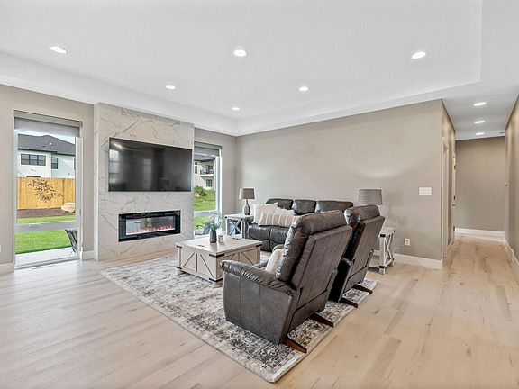 WOW! You will want to check out this stunning new home built by LGC in the popular Prairie West neighborhood. This home exudes sophistication and style from the inside out with its light, airy and contemporary feel. Walking through the front door you will immediately appreciate the sprawling tranquil maple design LVP flooring, generous ceiling height and elongated floor length windows. The contemporary fireplace is the focal point of the living room creating a relaxing atmosphere with its color changing feature. The kitchen is top of the line with the center island, ample storage space, hard surface countertops and high end Cafe appliances. Down the hall you will find a full bath, two bedrooms and a primary suite! The primary bedroom boasts a walk-in closet and bathroom with dual vanities and a gorgeous tiled shower. Moving downstairs are two more generously sized bedrooms and a full bathroom with modern finishes. The large finished open space is a perfect second family room or recreation room. Outside you will find the perfect place to entertain and relax. Enjoy the views of the next level landscaping from the patio that wraps around the length of the house. With designer blinds, irrigation and painted garage this home truly has it all. Come take a look!