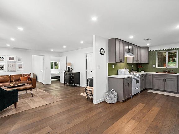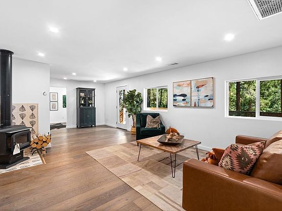 Beautifully remodeled "Little Cabin in the Big Woods"! Ready for owner occupier, weekend getaway, or short term rental. Motivated seller! Big price reduction. The property comes with 2 lots totaling just under 1/2 an acre of woodsy paradise with lots of tall trees! The cabin has been completely re-done, soup to nuts with a new roof, A/C + heat, wood flooring, new kitchen with hammered copper sink and vintage style appliances, new bathroom with tub/shower, new windows, upgraded electrical, recessed lighting, W/D hookups, new hot water tank, and so much more! The cabin can be sold fully furnished and boasts a West Elm queen sofa sleeper, queen bed in primary bedroom, twin over full bunk beds in second bedroom, twin daybed in the reading nook, dining space for four, and oversized rocking chairs on the deck with a propane fire table. Relax by the freestanding wood-burning stove set atop Clé tile with an apropos tree pattern, this sweet cabin won't last long!