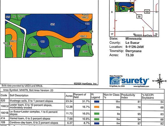Wonderful piece of farm land on tar road. Highly productive with great crop history, 86.2 productivity index, 1 building eligibility, New Prague Schools, call for maps & details.