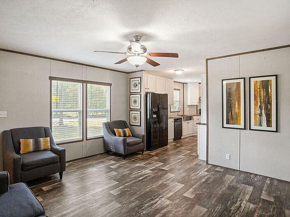 Like new beautiful spacious open floor plan mobile home featuring laminate wood floors throughout, white cabinetry in the kitchen and bathrooms. A barn door leads into the master bathroom which features a tiled shower. The light and warm color scheme in the home makes the space feel clean and airy with a hint of country ambiance. Located on a large corner lot and set back from the street the setting allows for privacy and yard space. Make this your home now!!!!
