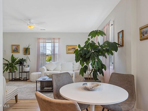 California Bungalow Living in Prime Location! Welcome to your dream beach-style home in very desirable mid-town Ventura! This stunning California bungalow offers the perfect blend of classic charm and modern amenities making it the ideal home for those who appreciate both comfort and style. A white picket fence enhances the home's curb appeal and frames a charming front yard that includes an orange tree and mature lemon tree providing super-sized lemons! Step into light, bright and airy interior with newer refinished hardwood flooring lending warmth and character throughout the house. Large living room is open to kitchen allowing great entertaining flow. The modern kitchen is a chef's delight with quartz countertops, farmhouse sink, self-closing cabinets and subway tile backsplash. 4 spacious bedrooms include primary with own access to backyard and a beautifully appointed en suite bathroom with mosaic rock flooring and glass tile trim shower. 3 additional bedrooms offer abundant space for family and guests. Hall bathroom boasts wainscoting and subway tiled tub/shower. Many updates have been completed in the home to include whole house filtration system, in-kitchen water purification system, newer windows, Ring doorbell, ceiling fans, between-the-glass window blinds, and more! The backyard can only be described as an outdoor oasis with multiple seating/entertaining/al fresco dining areas, swaying palms, mature English garden flowering plants, plus a rear area ready to accept your green thumb and vegetable garden beds. Delight in your own private orchard with apple, apricot, and avocado trees along with a plantain plant - all offering fresh produce right from your backyard. This desirable mid-town locale means you are near trendy wine bars, coffee shops, and in close proximity to gold coast beaches and surfing spots. Don't miss the opportunity to own this amazing home that combines classic California bungalow charm with modern upgrades in a prime location. Experience the best that Ventura has to offer. Welcome Home!