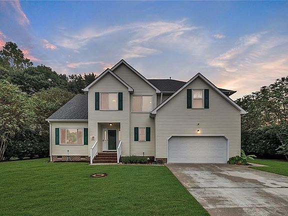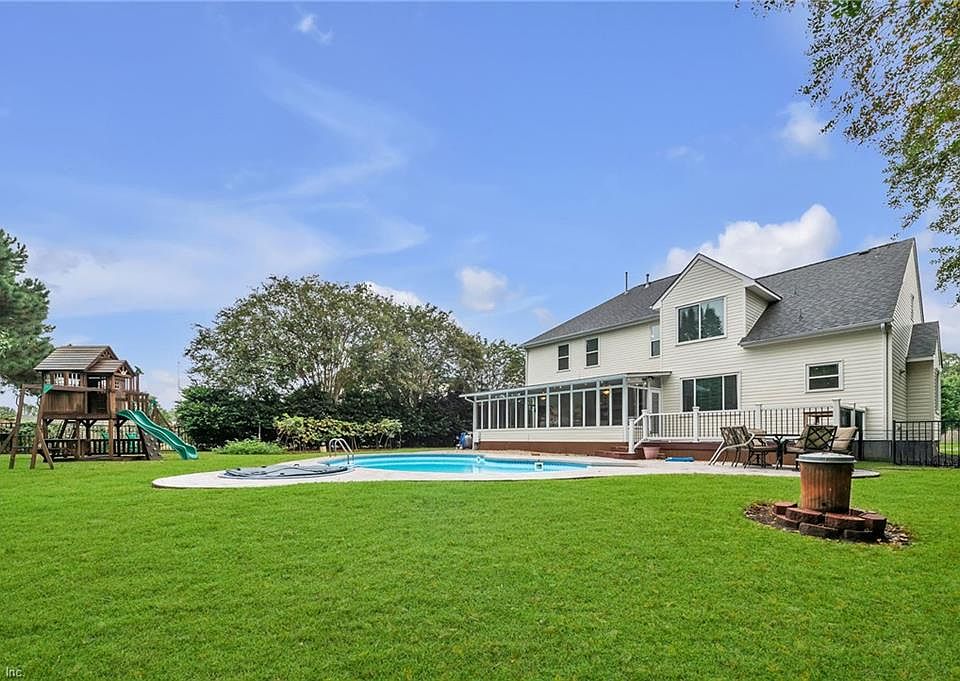 Step inside to this warm and inviting 5-bedroom traditional home on a quiet cul-de-sac in the desirable Suffolk Meadows neighborhood. This spacious 3,356 sq foot home features a renovated primary bath, open concept kitchen with two granite islands and triple pane windows (2021). A 4-season sunroom with skylights, overlooks a private backyard oasis with a 30,000 gallon salt water, heated in-ground pool with spa, composite deck and mature fruit tree gardens. Mature lilac bushes create a natural and aromatic privacy hedge. Spacious bedrooms and multiple living areas provide flexibility for everyday living and entertaining. Notable upgrades include Trane HVAC (2017), Roof (2017), sealed crawl space with dehumidifier (2023), and fresh interior painting and carpet (2023). Instant equity, list price below current appraisal price. Conveniently located near shopping, dining, schools and interstate access. Seller has clear termite moisture letter. Pictures reflect virtual staging.