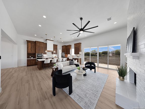 This thoughtfully designed residence features 4 spacious bedrooms, including two primary suites, 3.5 baths with a convenient Jack & Jill setup, and a dedicated home office. The open-concept layout showcases soaring 10-ft ceilings throughout, with 12-ft ceilings in the living room and primary suite, filling the home with natural light and an airy, elegant feel. At the heart of the home, the chef's kitchen boasts an oversized island, walk-in pantry, and plenty of space for cooking and entertaining. Both primary suites provide private retreats with spa-inspired finishes, while the secondary bedrooms offer comfort and versatility. Enjoy evenings on the covered patio, already designed for your future outdoor kitchen, with plenty of room in the backyard for a pool, garden, or playscape. A 3-car garage offers ample storage and parking. Zoned to the highly sought-after Navarro ISD, this home offers an excellent education option for families while being ideally located with easy access to Seguin's amenities and just a short drive to New Braunfels and San Antonio.