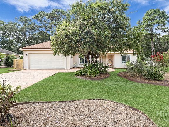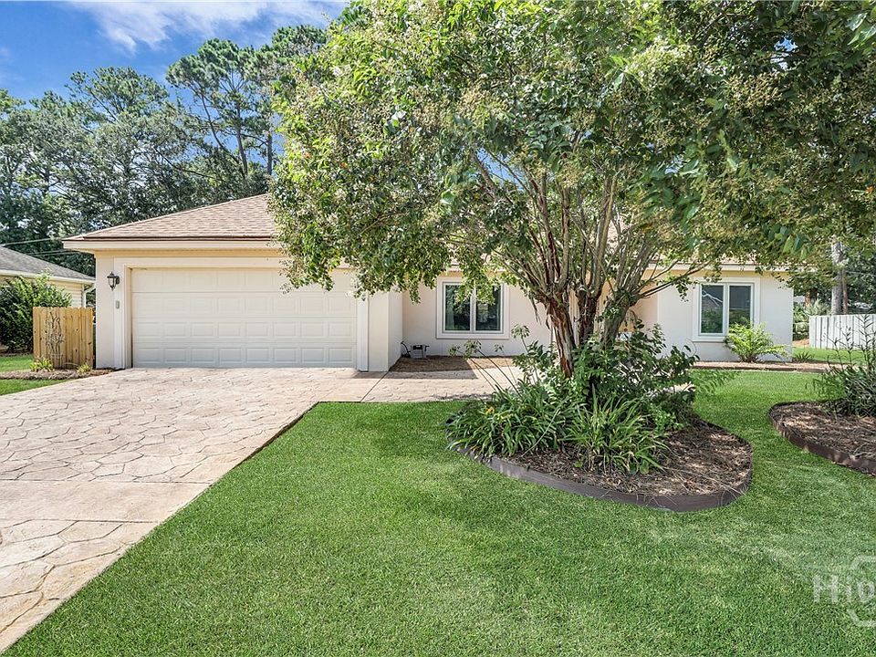 Perfect 3 bedroom and 2 bath home on Wilmington Island. Located on a quiet cul-da-sac. The home opens to a spacious Living room/dining room combination with vaulted ceiling, fireplace, laminate flooring and french door leading to a deck filled with sunlight and access to the fenced yard. Eat-in kitchen. Large primary suite featuring a bathroom with separate shower and tub. Split bedroom plan with two additional bedrooms with bath. Whole house generator! and on demand hot water tank. Large garage with workshop area. Stamped concrete driveway. Shallow well for irrigation. Bright and cheerful home!