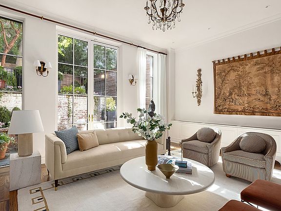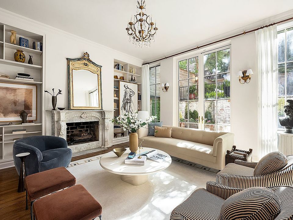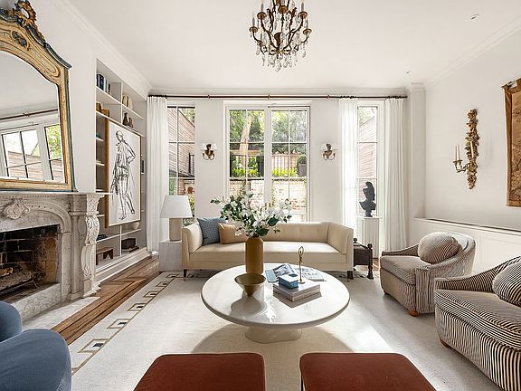 Behind the historic 19th century brownstone façade, discover exposed brick, refined millwork, crown moldings, recessed lighting, chandeliers, and bespoke shelving that speak to its thoughtful turn-of-the-century design. Past its private gated front entry, its open-concept layout creates a seamless flow, whether hosting a dinner party beside the wide kitchen hearth, descending into the sunken living room where majestic 12-foot ceilings and an elegant mantle are enhanced by floor-to-ceiling windows, or enjoy the private garden that promises serene outdoor moments.