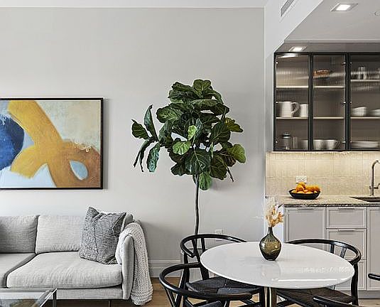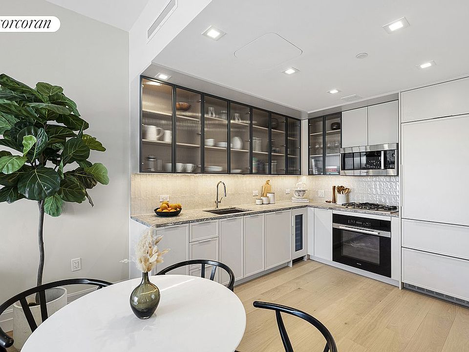 The well-planned kitchen offers a breakfast bar and is outfitted with top-of-the-line Miele, Bosch and Subzero appliances, Zelligetile backsplash and Ceppo Di Gre Greystone marble countertops. Custom matte finish Italian cabinetry and fluted glass fronts add interest to each residence and bespoke details unique to each home. 7-inch-wide plank white oak flooring runs throughout the home.