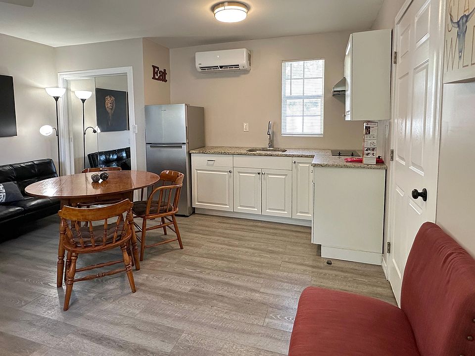 Open space consisting of bedroom, living room, dining room, kitchen with granite countertops, and a large bathroom