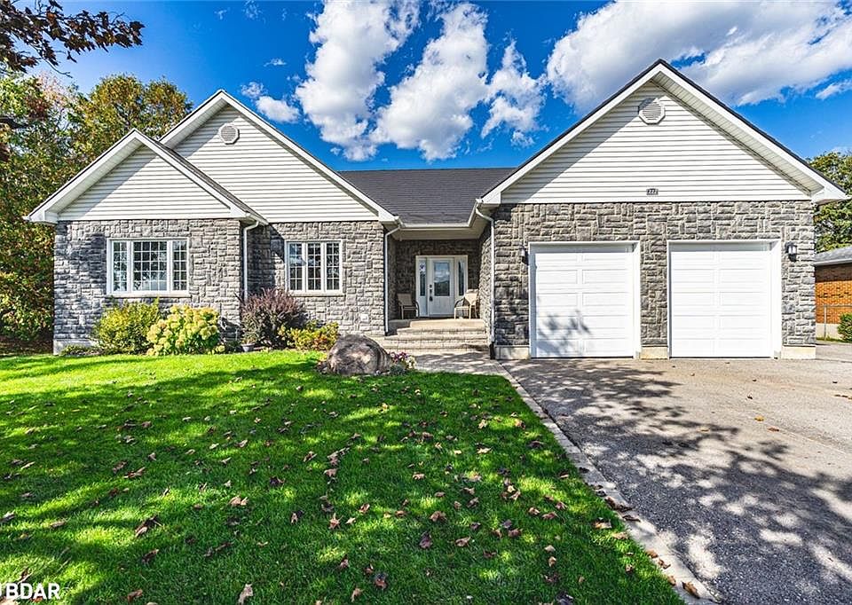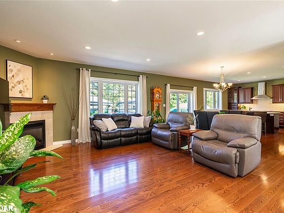 GORGEOUS CUSTOM ICF-BUILT BUNGALOW ON A SPRAWLING LOT WITH A WALK-UP BASEMENT INCLUDING SPACIOUS SEPARATE LIVING QUARTERS & OVER 3,600 FINISHED SQ FT! Nestled in the heart of Stroud, this custom ICF-built home is perfectly positioned across from an elementary school and steps from a local breakfast spot, shopping plaza, groceries, and the Stroud Community Centre Arena, and just five minutes from South Barrie’s shopping, dining, and GO Station. Outdoor adventure awaits with Innisfil Beach Park and Barrie’s Kempenfelt Bay, both under 15 minutes away, along with scenic hiking trails and nearby golf courses. The home’s timeless all-brick and stone exterior is complemented by a durable metal roof and beautifully landscaped grounds. Enjoy vibrant gardens, lush green space, and a concrete patio with a gazebo and gas BBQ hookup. An oversized double garage with doors just under 9 ft high, and an inside entry provides parking for two vehicles, while the driveway accommodates up to eight more, including convenient side parking with easy access to the basement walk-up. The bright, open-concept main level features 9-foot ceilings, large windows, and a welcoming living room with a gas fireplace. The kitchen impresses with built-in appliances, a large island with seating, modern finishes, pantry storage, and a walkout to the patio. Three spacious bedrooms include a serene primary suite with a walk-in closet and a luxurious 5-piece ensuite, complete with heated floors, a dual vanity, a separate shower, and a deep jetted tub. The fully finished basement offers high ceilings, a separate walk-up entrance, and versatile living quarters ideal for multi-generational families, featuring three additional bedrooms, a kitchen, a spacious rec room, a comfortable family room, and cold storage. Carpet-free flooring throughout, laundry on both levels, and abundant storage complete this exceptional #HomeToStay!