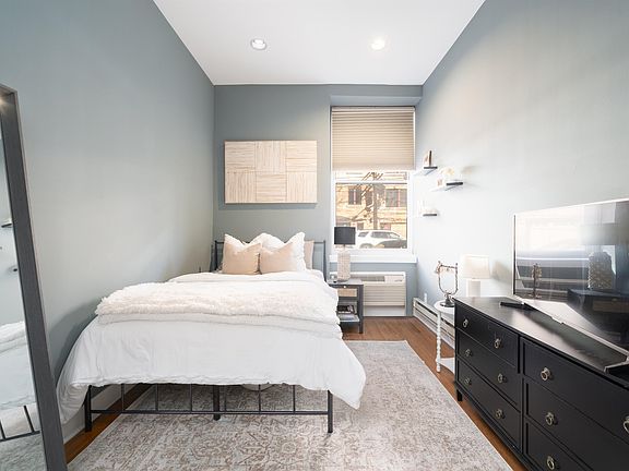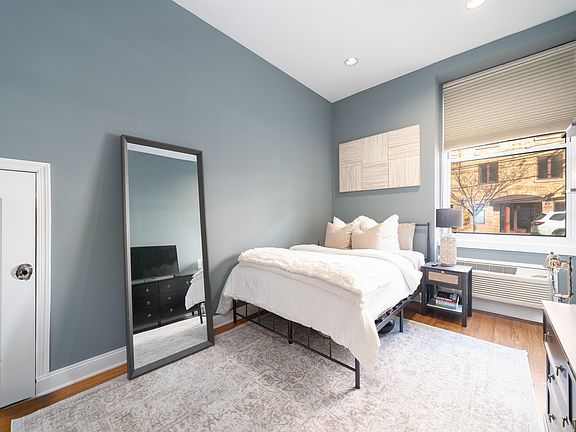 Located in a gated community, this 2-bedroom, 1-bath home offers a private entrance and access to a shared courtyard and outdoor pool. Inside, 12-foot ceilings enhance the spacious feel, while oversized windows bring in natural light. The fully renovated kitchen features quartz countertops, a ceramic tile backsplash, and stainless steel appliances. Additional highlights include exposed brick, hardwood floors throughout, in-unit washer and dryer, and a fully operational fireplace. Custom California closets provide generous storage. Conveniently located near the PATH and bus, with parks, schools, coffee shops, and restaurants nearby.