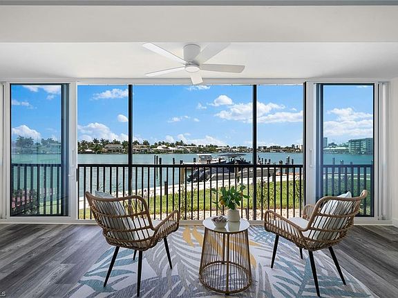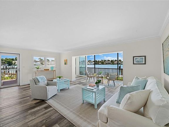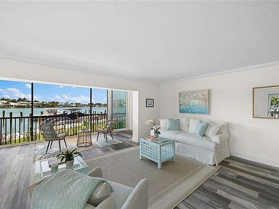 Completely remodeled 1,400-plus-square-foot condominium in a desired location! Boat slip is deeded with unit and is directly out your front door. So convenient and peaceful this home feels private and lives like a single-family home. Watch your boat from your living room, kitchen and lanai with access to the Gulf of Mexico through Doctors Pass, one of Naples most direct routes to the Gulf. Impressive panoramic views of the bay leading to the Gulf. In 2023-2024 new kitchen, new baths, new floorings, light fixtures, appliances, windows, doors and water heater. Community has new elevators 2024, new roofs 2025, new seawall 2021, new pool and outdoor furniture 2025, exterior paint 2020 and new roofs on all buildings completed January 2025. Furnished with new furniture and accessories. Boat slip can accommodate up to a 38-foot vessel. Boat slips in the area going for $200,000-plus in this ZIP code and this one includes slip with the condominium. Privately situated, this residence has parking and a storage unit near it. Venetian Village and the beautiful beaches are blocks away. Live a healthy life swimming, boating or relaxing by the gorgeous bayside pool. The private Moorings resident beach park is available for membership, and the Moorings CC is around the corner for golfers. Residents of CCI appreciate their neighbors, well-managed association in addition to weekly chickee parties. Live the Naples life in the heart of the Moorings just two blocks to the Gulf.