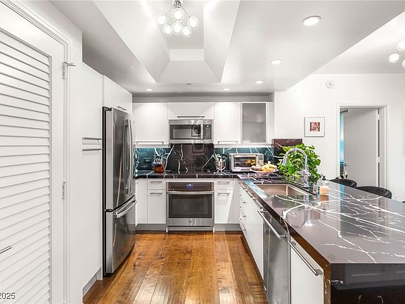 Experience high-rise luxury redefined at 222 Karen Avenue #2802 in Turnberry Towers. This newly reinvented 2-bedroom, 2-bath residence spans 1,405 sq. ft. with panoramic views of the Las Vegas Strip and downtown from two private terraces. The open-concept living space showcases hardwood floors, granite waterfall-edge countertops with matching backsplash, a built-in bar with wine cooler, and all-new appliances. Freshly painted interiors, new lighting, and marble bathroom floors elevate the home’s modern sophistication. Set within the prestigious Turnberry Towers, residents enjoy resort-style amenities including 24-hour guard-gated security, valet, concierge, fitness center, pool, and tennis courts. A rare opportunity to own a fully updated sky retreat with unmatched style and views.