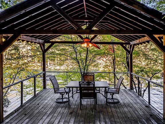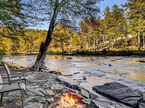 Impressive views! RIVERFRONT MOUNTAIN home on 2.28 acres, drive-down to private 190+ feet on the Coosawattee River, Ellijay. Seasonal long-range views (could be year-round), hardy-board, and stone exterior, ELEVATOR. Main Level: master suite, open concept living with river views from all rooms, 2-story great room open to kitchen/dining, PorchLife 365 new enclosed porch, laundry room, 1/2 bath. Upper Level: two bedrooms with J&J bathroom. Terrace Level: Master suite with views, high-ceiling entertainment space w. bar and 1/2 bath, garage was closed & tiled (additional 540 sqft rec room). Small workshop. Loads of porch space. Generator, Tons of storage. Walk/drive (ATV) to the river to FISH, tube, kayak, swim or relax on your land. Resort amenities: heated indoor pool, 2 outdoor pools, tennis, pickleball, 18 hole mini golf, multiple riverfront parks, and more. Great for a vacation home or full-time living. Call for a quick easy showing.