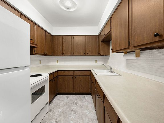 This 1 bedroom unit has been freshened up and is ready for move in. New carpet, fresh paint, laminate flooring, refrigerator, new bath vanity, toilet, refinished tub and tile and flooring. Clean and ready for you. Plenty of outdoor parking and across from the hospital. 55+ building, no rentals, no pets.