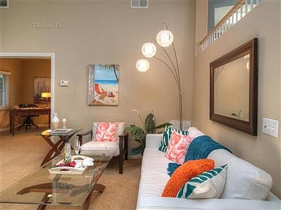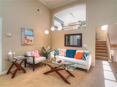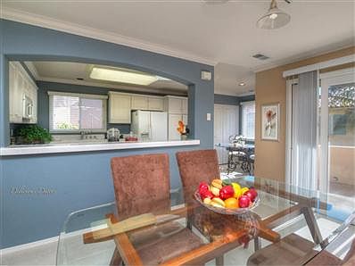 Gorgeous Mediterranean style Mesa townhome close to Shoreline Park, Lazy Acres and restaurants. 3bd 3ba w/attached 2 car-gar, vaulted LR, crown moldings, flagstone patio, a luxurious master w/ FP, spa like bathroom, massive walk-in closet & a sunny balcony w/a peak of the ocean and islands. Second guest suite with private bathroom and walk-in as well. The third bedroom makes for a great office.